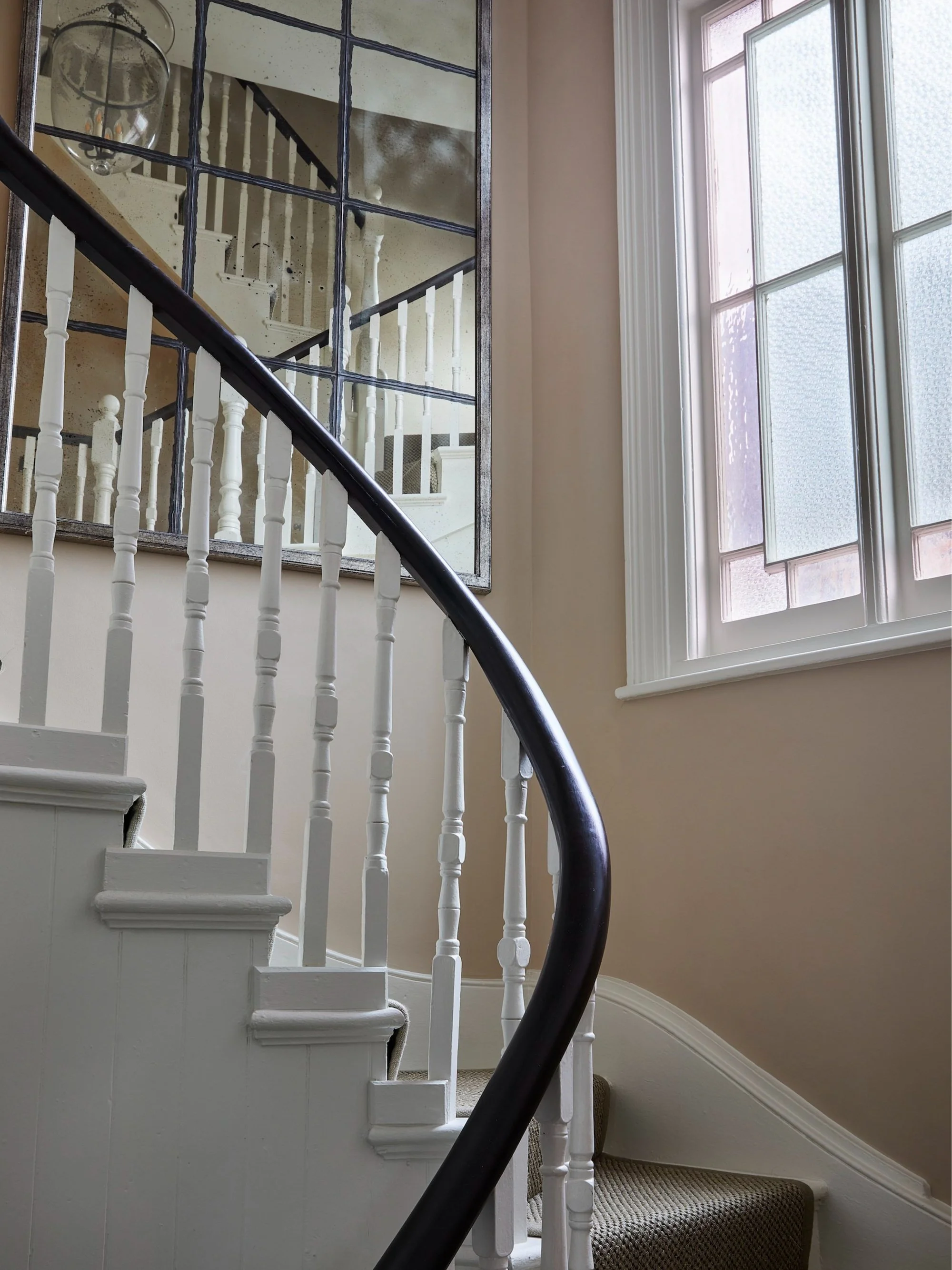 Upstairs the two bedrooms were opened up to connect with a dressing room and a rear bathroom extension, creating a spacious master suite with buff paintwork unifying the serene space.